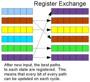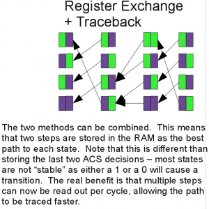 The register exchange method is fairly basic — each state has an N bit register associated with it. The best path is loaded into this register each cycle. This largely prevents the use of RAM. At the same time, the best path data is very easy to access. For a 7b constraint length, this would mean 128 registers with at least 42b each, which is a considerable amount of registers.