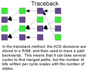 There are two basic ways to keep track of the best path to get to each state. These are the register-exchange, and the traceback method. The register exchange is very easy to understand, and works well for small constraint lengths. The traceback method is a bit more difficult, but works well for longer constraint length codes.