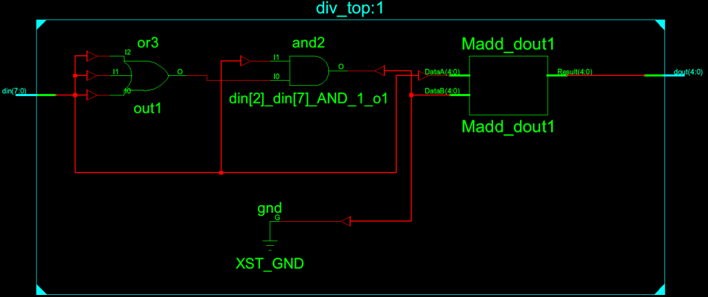 Notice that the schematic from a simple division by constant 8 infers some logic to perform the round toward zero that is implied by VHDL.